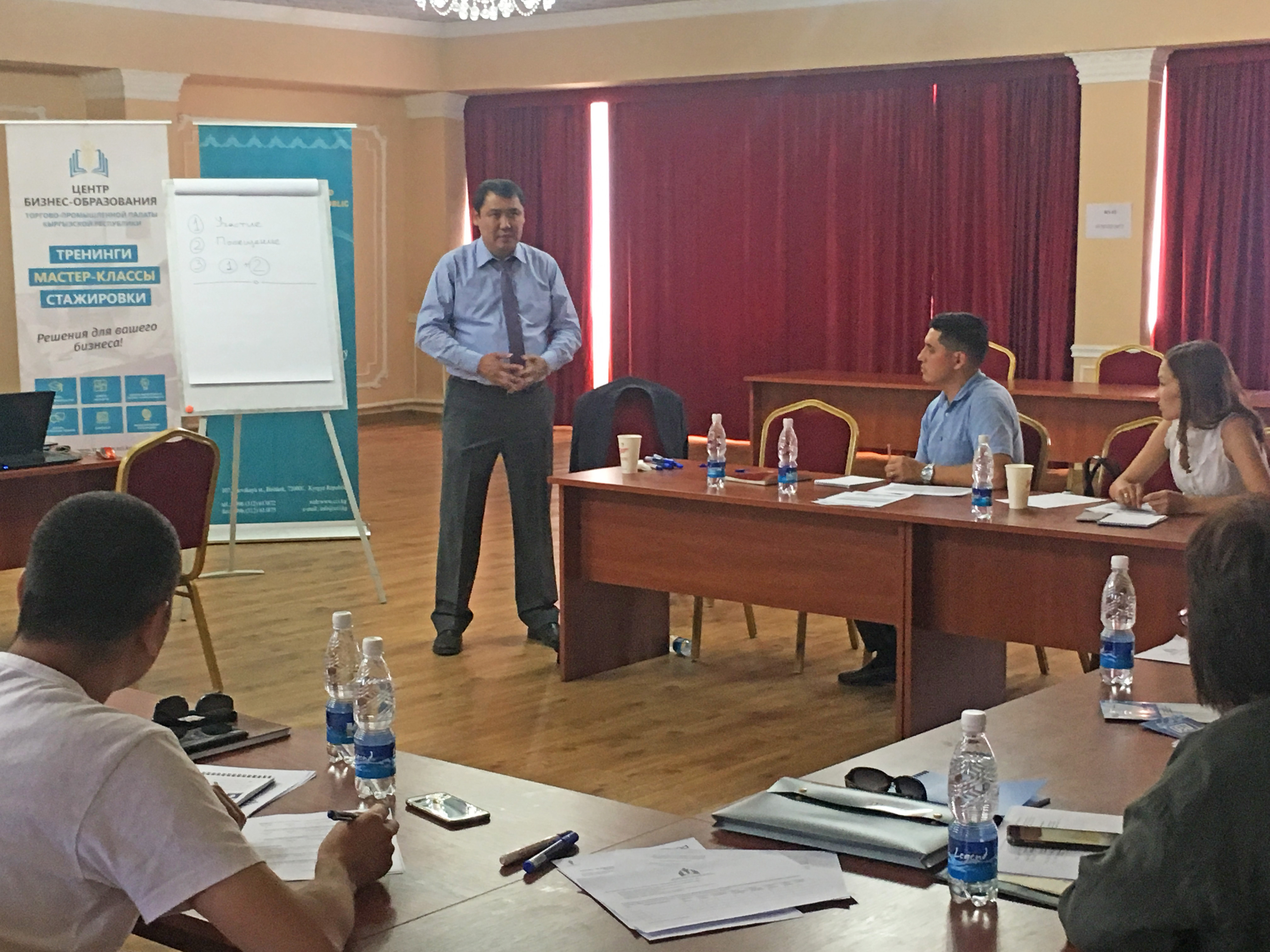 Гость тренинга Уран Ниязалиев,руководитель компании «Дан Агро Продукты», поделился собственной историей успеха. Благодаря участию на международных выставках, его компания наладила экспорт своей продукции, расширила бизнес. Также рассказал о проблемах, с которыми могут столкнуться кыргызские предприниматели при сотрудничестве с зарубежными партнерами.
