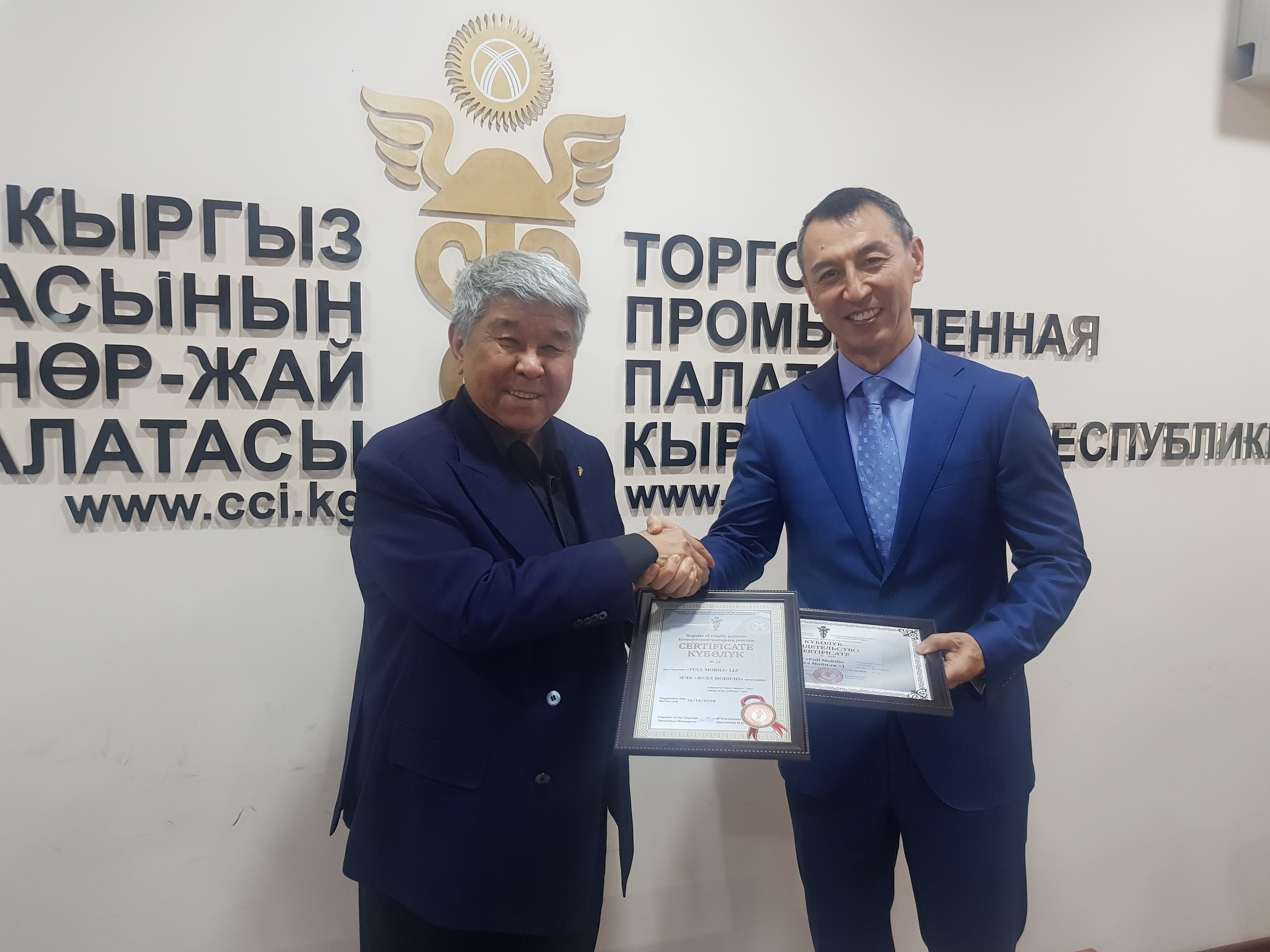 Отметим, что ОсОО «Фулл Мобили» кроме сертификата, подтверждающего членство в ТПП КР, был вручен еще один сертификат о включении этой компании в Реестр надежных партнеров Палаты Кыргызстана. Включение в Реестр дает его участникам официальное признание в качестве надежного делового партнера, возможность получения достоверной экономической и финансовой информации о потенциальных партнерах, возможность достойно представить свое предприятие на международном рынке.