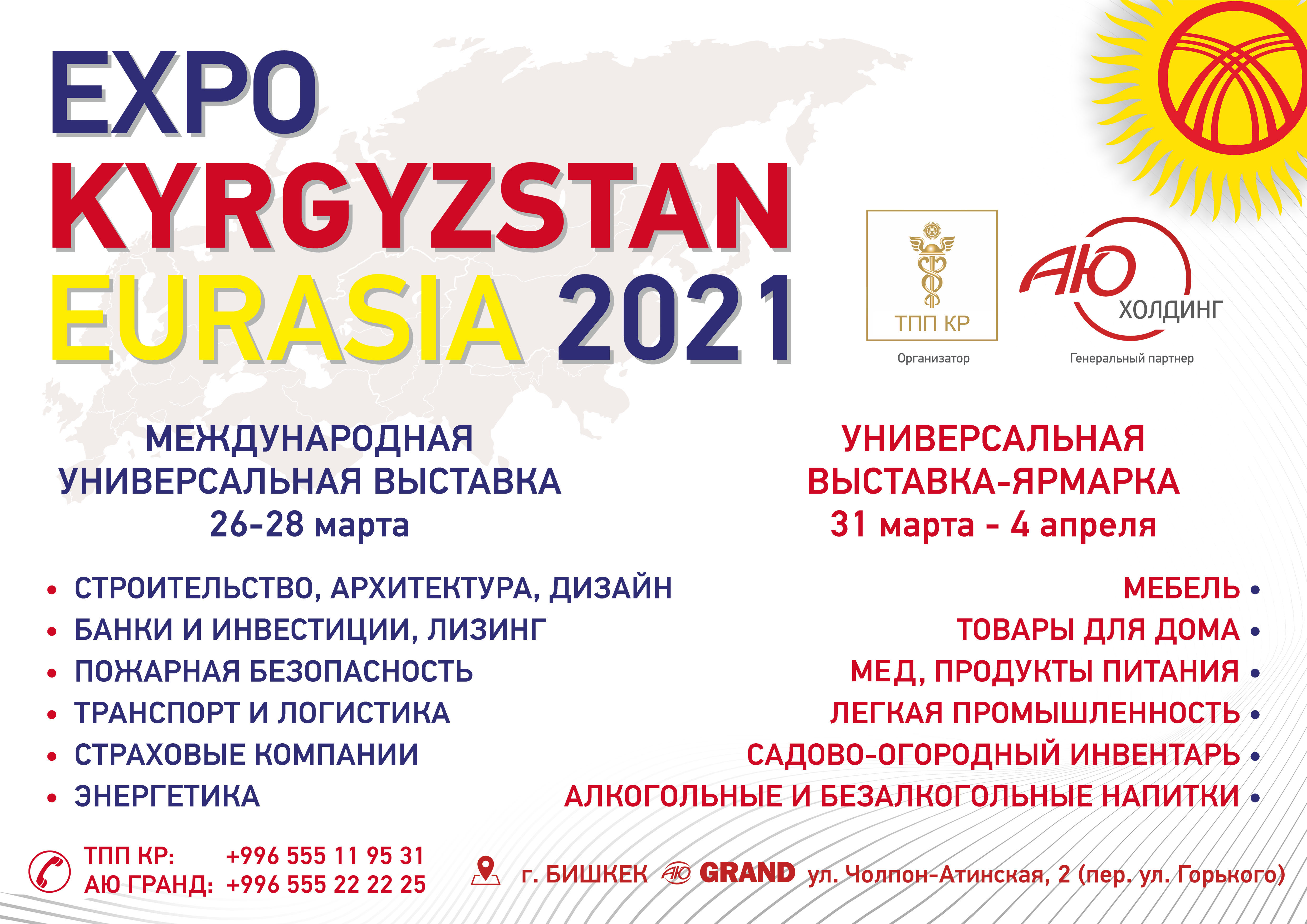 Торгово-промышленная палата Кыргызской Республики в партнерстве с «АЮ Холдинг» проведет первую после пандемии Международную универсальную выставку «Expo Kyrgyzstan — Eurasia 2021». Она будет проходить в два этапа. Экспозиция первого этапа будет состоять из товаров и услуг строительной отрасли, банковской и страховой сфер, лизинга и энергетического сектора. Вторая часть — это ярмарка товаров легкой промышленности и продовольствия, которая начнет работу с 31 марта.