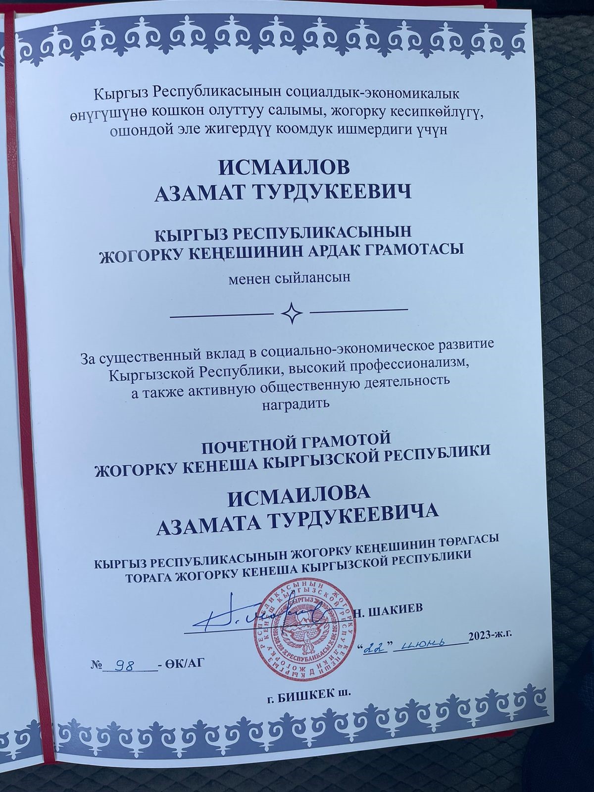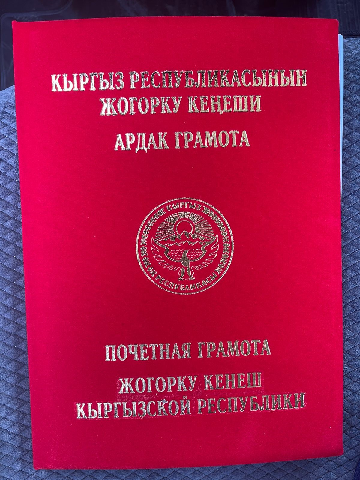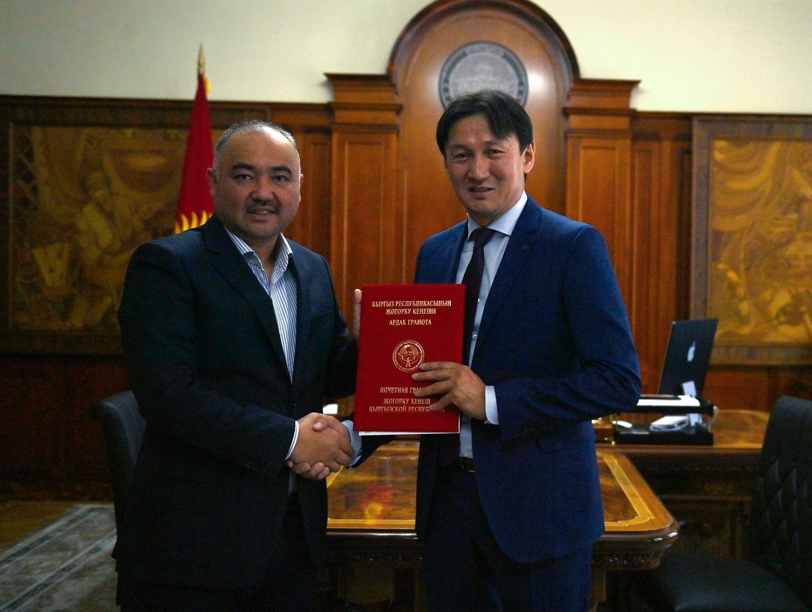 Лично торага Жогорку Кенеша, Нурланбек Шакиев, вручил грамоту.